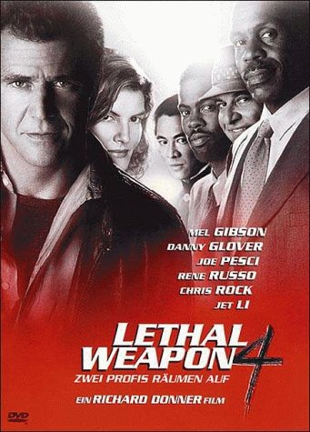 |  Lethal Weapon 4 - Zwei Profis räumen auf (Leathal Weapon 4) | Entstehung: | USA 1998 | | Laufzeit: | 122 min. | | FSK: | ab 16 Jahre | | Regie: | Richard Donner | | Darsteller: | Mel Gibson, Danny Glover, Joe Pesci, Rene Russo, Chris Rock, Jet Li | | Musik: | Michael Kamen, Eric Clapton, David Sanborn | | Handlung: | Hinter einem Menschenhändler-Ring stoßen die Profis auf ein mörderisches Komplott der chinesischen Triaden-Mafia und geraten dabei selbst auf die Abschussliste. Doch zusammen sind sie nicht zu schlagen - auch wenn sie bei ihren haarsträubenden Shoot-Outs und Verfolgungen eine Schneise der Verwüstung quer durch ganz Los Angeles ziehen... |